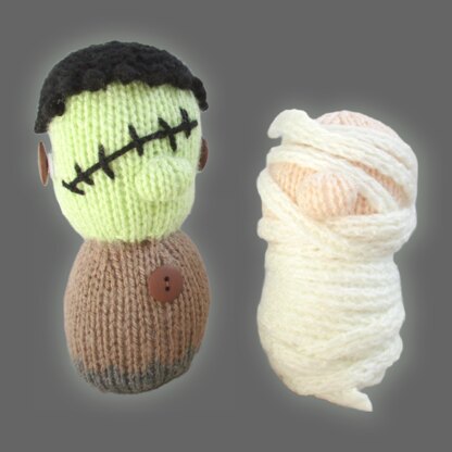 It’s Frankenstein versus the mummy, a spooky pair of Halloween knits! Frankenstein’s body incorporates Fair Isle (stranded) colour-work, and their hair uses a picot cast on. The mummy is wrapped in a knitted bandage, but you could use real bandage strips or ribbon instead if you wish. Designed by Amanda Berry @fluffandfuzz, the toys are knitted in acrylic DK yarns on single pointed needles (not in the round). For confident beginners and above, other techniques used include casting on and off, knits, purls, increases and decreases, and seaming to finish.