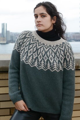 Fraser Fir is a top down, yoked pullover. The yoke is worked in stranded colorwork with tree and diamond motifs. The yarn used for the sample is delightfully soft, mYak Baby Yak Medium.