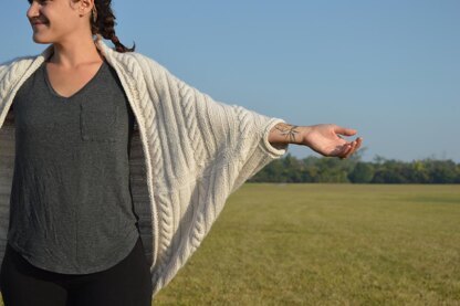 The Free Bird Cocoon is an oversized, cabled, cocoon style wrap. The center back panel features mirrored cables from Norah Gaughan’s Cable Source Book with smaller cables centered between. Stitches are picked up along each side and cables and knit columns are worked outward from the center to create a large rectangle. After blocking it is folded and live stitches on the ends are grafted together to give it’s shape! I-cord edgings are worked around the body and sleeve edges for a nice smooth edge. Knit up in Shibui Knits Drift yarn (fine merino and cashmere) the Free Bird Cocoon is a soft, luxurious way to stay cozy all winter long!