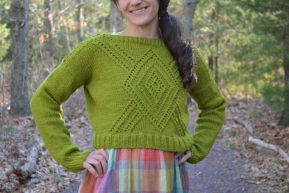 Free Folk is a drop shoulder pullover. The design features a large geometric motif created from twisted stitches. The waist starts off fitted and increases are worked to make the shoulders wider. The paired cropped length and fitted sleeves give it a modern, feminine feel. Knit up in Barrett Wool Co.’s Home Worsted Weight soft, cozy yarn, it makes the perfect statement piece for your handmade wardrobe!