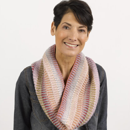knit in Ombre Minikins. The cowl is knit in the round from the bottom up. The