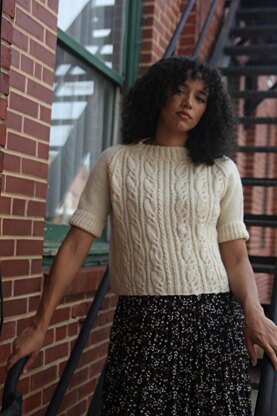 French 75 is worked seamlessly from the bottom up and shaped along raglan seams. It features lovely, elegant cables and a few special details to give it a delicate, vintage vibe. If substituting yarn, choose a worsted weight fiber in a classic wool or wool blend for a similar look. Pattern shown worn with 5"/12.75cm of positive ease, but works with a more fitted silhouette as well. Notes are included to alter length, width, sleeves, and neckline if desired.