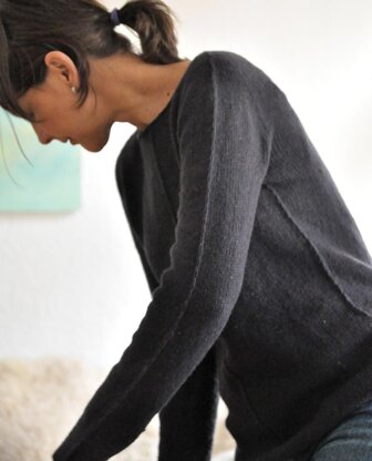 The sweater is worked seamlessly top-down in one piece, using contiguous set in sleeves, highlighted with faux seams throughout.