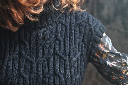 Frisky witch is a ribbed and cabled vest, designed to be knit with or without the cowl neck. Cables on this one are quite simple and only worked every few rows, so this flies off the needles. The design here is bold, and in a deep black aran weight yarn, it's a dramatic wardrobe basic!