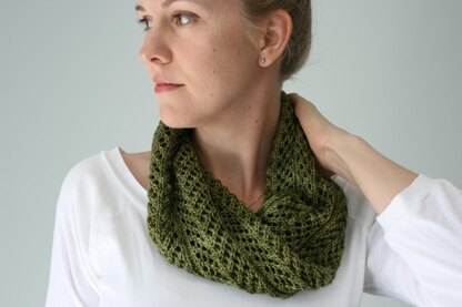 Frons (Latin for foliage) is a quick, single-skein cowl with a pretty, leafy, allover lace pattern. The cowl is knit in the round from end to end and twisted before the two ends are joined. The lace pattern is a simple, rhythmic 4-row repeat – it knits up in no time and creates a very pretty little cowl that you’ll want in every color.