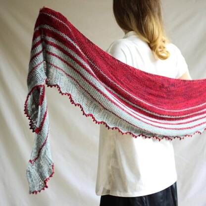 Frost & Flame is a shawl designed to use two skeins of fingering-weight yarn, one solid and one variegated, though it is also beautiful with 2 solid or semi-solid yarns. The main body pattern is a simple brioche stitch intended to bring out the beauty of a variegated or semi-solid yarn as well as provide an interesting but rhythmic main stitch pattern. A lace pattern at the border compliments a solid contrast-colour and creates a delicate, frost-like finish for this crescent-shaped shawl.