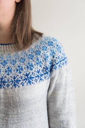 As autumn breezes give way to winter chills, woolen sweaters become a daily staple. This top-down sweater is sure to become a favorite pullover throughout the season. The neckline begins with a touch of frost as Fair Isle snowflakes begin below the collar and increase in both size and color intensity around the shoulders. Mini-skein gradients create an eye-catching colorwork effect, while waist and hip shaping create a flattering fit. Colorful detailing along the bottom of the sweater body and sleeves give this garment a unique look while making it interesting to knit. Cozy up to the fire and grab your needles… it’s time to get Frosted!