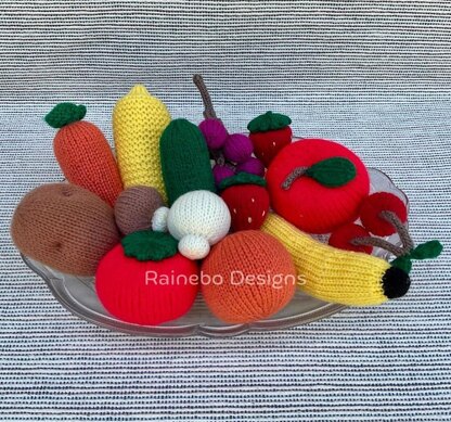 These Fruits & Veggies are knit in the round, (Intermediate Level), using Magic Loop (or double pointed needles). All the foods are approx. realistic sizes and are created using #3-light wt. (DK wt.) yarn and size 3 (3.25mm) 32” Circular Knitting Needles (if using Magic Loop).