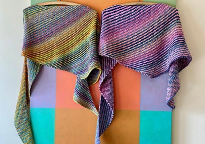 The perfect vehicle for self-striping yarn, GAMUT shawl uses 2 different colorways and a simple textured pattern to produce a stunning celebration of color!