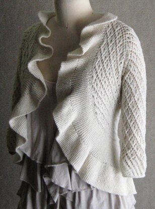 Celebrate your inner girly girl with this lacey and ruffly open-front cardi ... knit from the top down, raglan style, in a simple lace pattern with ruffles worked as you go in garter stitch short rows (no fussing with wraps, slips or k2tog's) curving around to the back, and with a pretty detail at the end of the 3/4 length sleeves. Pretty enough for a wedding, easy going enough for jeans and a tee.