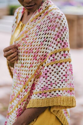 Bring the flowers to any party when you wear the Garden Party shawl, a floral-inspired crochet triangle scarf. Constructed top-down, a sea of colorful fan stitches contrasts perfectly with bold stripes. The shawl is finished with a textured ribbed border.