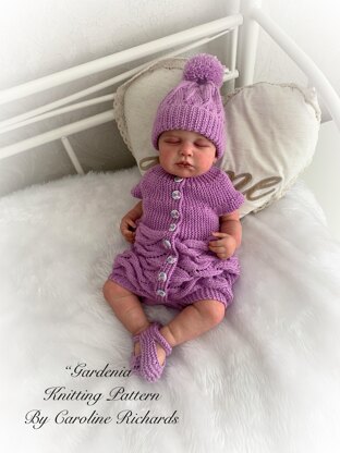 Sideways knitted romper suit set. The romper is knitted sideways using short rows and requires minimal sewing, just the gusset to sew up