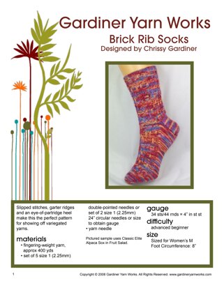 Gardiner Yarn Works Brick Rib Socks PDF is a Knitting pattern by Chrissy Gardiner, available as a Downloadable PDF. Super fun to make, this pattern could be your next masterpiece!