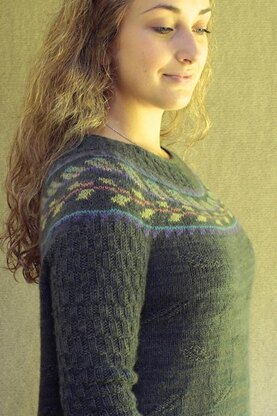 Colorful birds and leaves zig and zag across the stranded yoke, and bas-relief birds are scattered across the body of this loose-fitting pullover. Slender sleeves are worked in a staggered rib pattern and are finished with stranded leaves at the wrists.