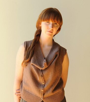 Georgia is a drape-y vest that may be worn open allowing the front to flow or buttoned up which creates a cowl neck shape. It is worked flat in one piece and is seamless.