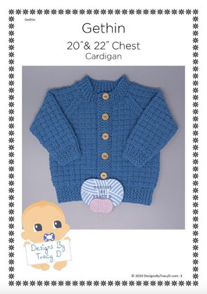 Gethin is a unisex Baby Knitting Pattern for a beautiful cardigan. It is made using DK yarn with 3.25mm & 4mm needles and will fit a 20" and 22" chest (finished size) 150g of DK yarn required for each size. 6 buttons for the 20" size & 7 buttons for the 22" size.