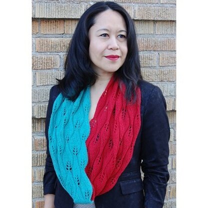 Hope Infinity from Getting Purly With It is cowl that is knitted flat and the ends are seamed using the mattress stitch. The stitch pattern used is called “Candle Flames” from the Barbara Walker stitch pattern book. This cowl is worked in two colors of Jade Sapphire Brigadoon, but of course could be worked in one color as well.