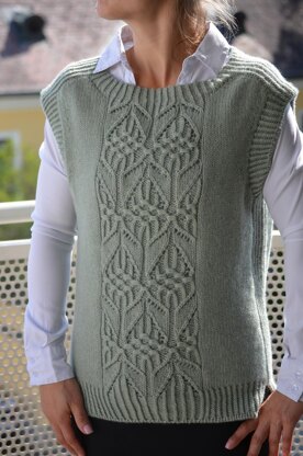 The slipover isworked seamlessly from the top down. You start with the twisted ribbing on the neckband and continue with saddle shoulders and neck shaping. After that, the back and the front are worked separately and joined together at the underarms. Armhole bands are worked last. Split hem is another elegant detail to the slipover.