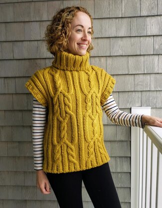 The body is knit flat from the bottom up, beginning with a split hem. Stitches are picked up from the body for the turtleneck and armhole edgings, each of which is worked in the round. A tubular cast-on and cast-off are used for the hem and turtleneck to ensure that both have sufficient stretch.