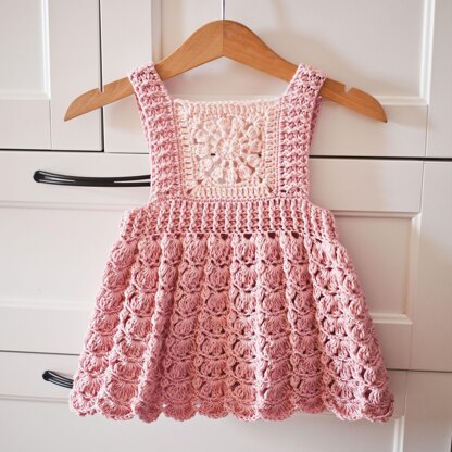 Granny dress is worked starting with the granny square. Once the front bib and straps are completed you will have to work the skirt, down from the waist. The dress can be made at any length. It can be worn just as it is or over a t-shirt. If you need more coverage for the front you can make the straps wider.