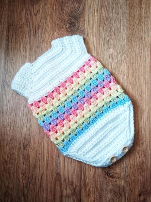 This cute little romper is made using hdc stitches for the yoke then a granny stitch for the body and back to hdc for the crotch. There will be one button at the back of the neck to fasten and two buttons for the crotch.