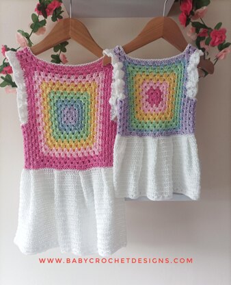 This dress is made using 2 granny squares, then adding some shaping and a skirt or it can be made as a top without the skirt. It can be made in so many cute colours and is perfect for sunny days or over a sweater and tights for the cooler days.