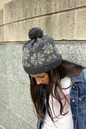 This is an easy, fun knit with a little slouch up top and a great, smushy pom AND you can use up your two skeins if you knit it twice, reversing the colors of the background and flowers on each hat. Give the second to a friend!