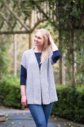 Greenwich is a comfortable tunic vest that is worked from the bottom to the underarms in one piece, including the center front Moss Stitch panels. Stitches are provisionally cast on for the narrow sleeves, then the back is worked to the shoulders, which are shaped using your choice of short rows or bind-offs. The front sleeves are picked up from the provisional stitches, then the fronts are worked in a similar manner to the back to the end of the shoulders, leaving the collar stitches to be worked to the center back neck, joined using 3-Needle Bind-Off, then sewn in place. Finally, armhole edging finishes off the piece.