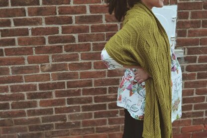 The Grosse Ile Wrap is a generous rectangular knit wrap. It features textured and cabled stitches with chevron purl stitch sections. It is knit in one piece side to side; a great cozy piece for layering.