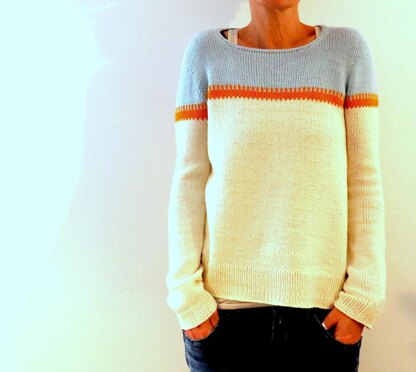 This sweater is worked seamlessly from the top down and uses the contiguous set in sleeves method developed by Susie Myers. Knitting starts with the cast-on of the stitches for the back, the shoulders and some first stitches of the front. You will increase before and after the shoulder stitches on every row until you reach the final cross-back width. From that point increases are done to shape the sleeve caps, at the same time the neck shaping is done by adding stitches to the fronts. Once all shaping is complete, the sleeve stitches are placed on hold, to work the body first top down to the hem. Sleeve stitches are picked up again to work the sleeves in the round top down to the cuffs. Neck finishing is worked last.