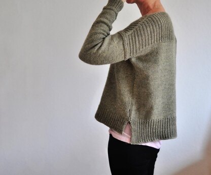 HAPPEN is worked seamlessly from the top down. You start working the back for the length of the armhole. Then you work the front for the length of the armhole. Join back and front to work the body in the round down to the bottom ribbing, which is split and worked flat. Pick up the sleeve sts to work the sleeves in the round. HAPPEN features horizontal stitches, which are explained in the pattern and in a video that is linked.