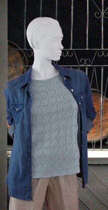Inspired by classic shell patterns, this piece will go from summer adventures to the perfect layering piece the rest of the year. This is a standard fitting sleeveless shell worked in overall pattern, beginning with separate front and back tails. Work is joined to continue the body in the round to the armholes. After dividing the front and back to shape the armholes, each half is worked separately to the shoulders. Shoulder and neck shaping on front and back create a flattering fit. Shoulders are joined using Three-Needle BO, and a few rounds of garter edge both armholes and neck.