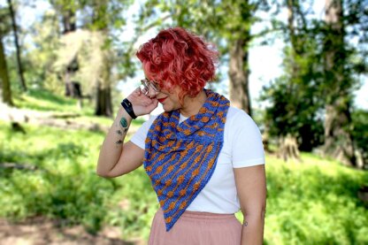 This warm weather ready cowl uses 2 colors of DK/sport weight yarn in a wool blend for a drapey effect. Short rows create contrasting circles in the middle of rows for an eye-catching design. A built-in i-cord provides a beautiful finish along the edges. Knit flat, this cowl is then seamed to create an easy to wear bandana shape.