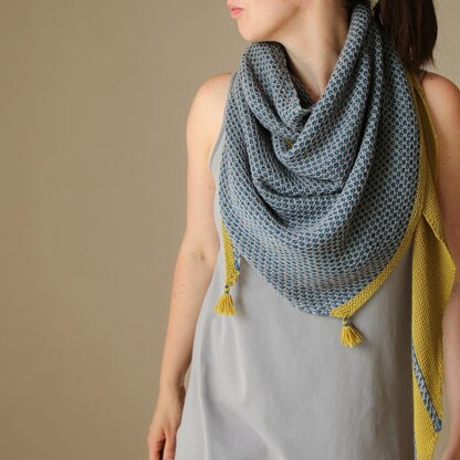 A wide swath features a two-color stitch that is easy to knit and looks lovely from both sides, while a striking contrast garter section creates interest. Tassels add a fun touch.