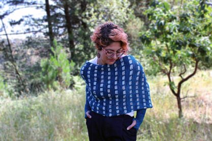 This sweater-scarf starts in the round with a ribbed sleeve that incorporates a thumbhole for extra coziness. The sleeves are worked in a 1x1 rib in the main color, while alternating sections of a slipped-stitch check-pattern add bright pops of color make up the body. This design mimics a warm hug, something we’ve all been craving from friends and family during this pandemic.
