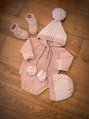 This hooded romper is knitted from the hood down, the textured hood design is a simple two-colour slip stitch that is easy to do. The pattern has line-by-line instructions for the complete set of Romper, hat, and booties. The whole set is Knitted back on forth on straight needles.
