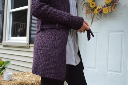 Home Again is a long, open cardigan featuring ribbing on the bottom and sleeve edges and continuing up the center front. The neckline continues up and is grafted together in the back and seamed to the top of the back piece. Sleeves are worked from the bottom up in the round and are set into the cardigan body. Afterwards a belt is knit up and strung through i-cord loops at the waist. Knit up in Berroco’s new Catena chunky weight merino yarn, this sweater is a super quick knit and deliciously cozy and comforting to wear!