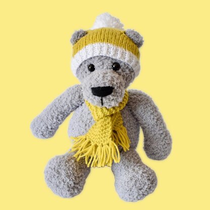 Berry Bear keeps warm on winter days in their Honey Hat and Scarf set. The hat and scarf are knitted in acrylic DK yarns which are machine-washable if your bear gets grubby on their adventures. Designed by Amanda Berry @fluffandfuzz, the hat and scarf are knitted on single pointed needles (not in the round). This free knitting pattern is for the hat and scarf only; the Berry Bear toy pattern is sold separately. For confident beginners and above, techniques used include casting on and off, knits, purls, increases and decreases, and seaming to finish.