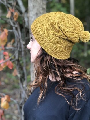 The slightly slouchy hat is constructed from the brim to the crown, seamlessly with uninterrupted cabling.