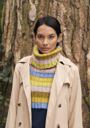 A great layering piece for the cooler months, this cowl bib with a generous roll neck from Georgia Farrell is both practical and stylish. Knitted using two shades of Kidsilk Haze and three of Felted Tweed, this useful, on-trend layer will keep you warm and cosy this winter.