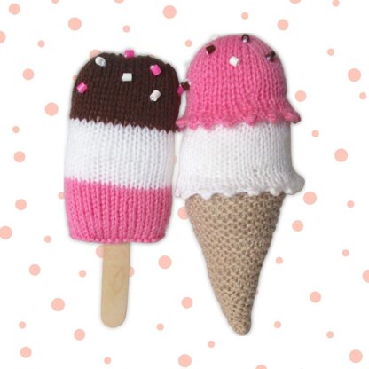 Knit some sweet Ice Cream Treats - an ice cream cone with 2 scoops, and an iced lolly (or popsicle). Designed by Amanda Berry @fluffandfuzz, these toys are knitted in acrylic DK yarns on single pointed needles (not in the round). The ice cream uses a frilled cast on technique and a three needle join, and the lolly uses knitted stripes and Kitchener stitch grafting. For confident beginners and above, other techniques used include casting on and off, knits, purls, increases and decreases, and seaming to finish. The ice cream is 8.5cm wide x 21cm tall, and the lolly 12cm tall x 8cm wide (not including the stick).