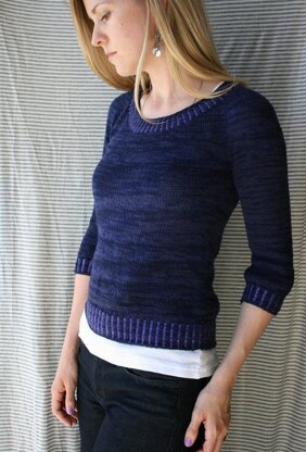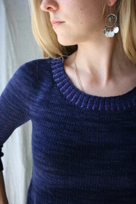 Indicum (Latin for indigo) is a beautifully simple pullover with a minimalist embellishment of corrugated ribbing, a simple two-color technique. This light sweater is made from two fingering weight yarns -- choose one for the body, then use leftovers of your favorite sock yarn to add at the collar and hems, either a similar shade for a subtle accent, or a variegated yarn for a unique look. Indicum is simply knit from the top down, all in one piece, with minimal finishing. The scoop neck is formed with short rows; the sleeves are knit down from the underarms and end in very slight puffs. This lovely piece is perfect for transitional weather, layering, and playing with color.