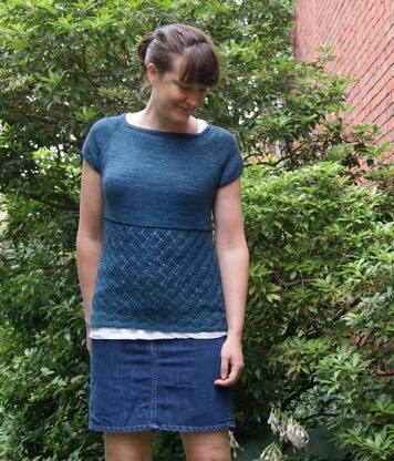 Intertwine is seamless, but is worked in two pieces- the top and short sleeves are worked in the round, from the top down, in one piece. The bottom is worked in the round, from the bottom up, in one piece in a simple lace pattern. The two pieces are then joined using the Three Needle Bind Off method.