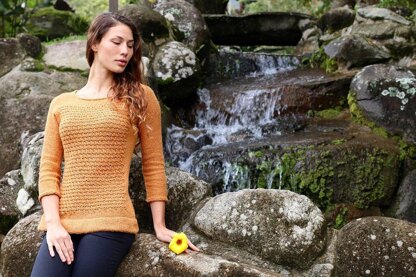 Worked in the round from the bottom up, there is gentle waist shaping, sleeves worked in one piece, and short row shoulder shaping.