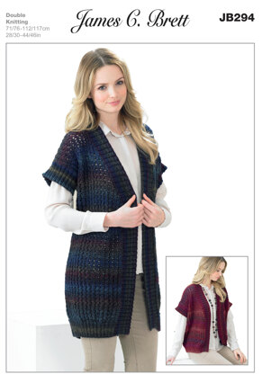 Knit either a short or a long Waistcoat by James C. Brett. The pattern includes directions for both, and each are knit in self-striping Marble DK yarn. An allover lace pattern adds texture and interest, as well as the ribbed edging.