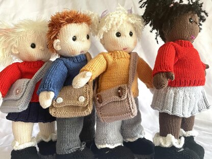 Do you remember your first day starting school? It's one of those memories that stay forever. I remember my first teacher and the first book I learnt to read, the series was call Janet and John. Many of you will have little ones starting school for the first time soon. How special they would feel with their very own companion to hold their hands or to come home to and share their first exciting day with. Janet and John, worked in double knit yarn, stand at 13 inches/33cms. The feet, legs and body is knitted flat, in one piece and assembled. The head, knitted flat, has been created with a knitted on wig cap rather than knitting a separate one and attaching, this way it’s a lot easier to work hairstyles. The arms are knitted separately and attached. Included in this pattern are Doll; Sweater; Skirt; Trousers; 2 shoe options and satchel. Also included with the pattern is a very detailed making up guide with lots of photos, hints and tips.