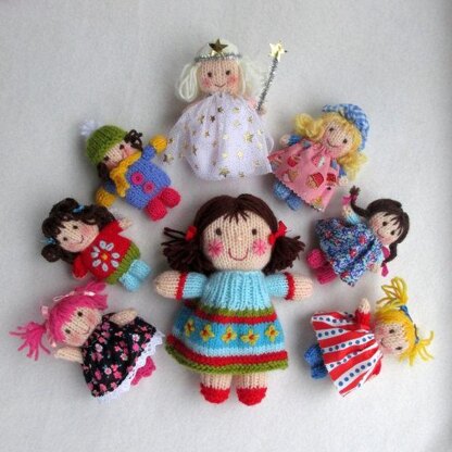KNITTING PATTERN contains instructions for JENNY (the large doll). The seven smaller JOLLY DOLLIES are made from the same basic pattern with variations in hair style, colour of yarn and clothing. They can be knitted entirely in yarn or wear pretty dresses made from tiny scraps of fabric (pattern for fabric dresses include).