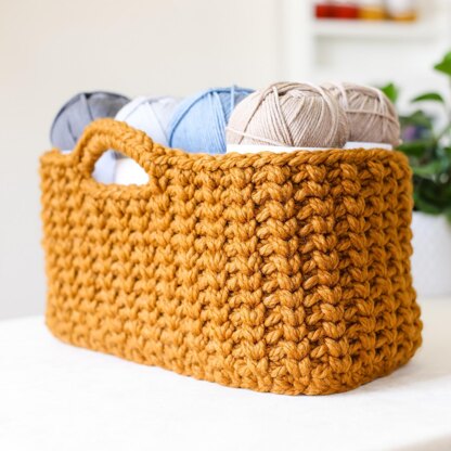 Get yourself organized with the practical and cozy Jessie Stash Basket. These large rectangular baskets are made by holding two strands of super bulky yarn together with a 9mm hook. Alternate the waistcoat stitch and single crochet in the back loop for an unexpectedly beautiful texture. Bet you can't make just one!