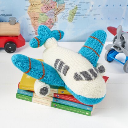 Knit a cuddly Jet Plane for budding pilots. There is no tricky colour-work to do as the windows are knitted separately and sewn on to the finished toy. Designed by Amanda Berry @fluffandfuzz, the aeroplane is knitted in acrylic DK yarns on single pointed needles (not in the round). For confident beginners and above, other techniques used include casting on and off, knits, purls, increases and decreases, knitting stripes, and seaming to finish. This toy measures 24cm long x 30cm wingspan.