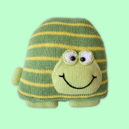 Cheer up your sofa with a cuddly tortoise cushion! The tortoise body is knitted in two pieces and sewn together around the edges The head is knitted separately and sewn on the front, and the patch on the back is decorated with blanket stitch. Designed by Amanda Berry @fluffandfuzz, the tortoise is knitted in acrylic DK yarns in stockinette stripes on single pointed needles (not in the round). For confident beginners and above, other techniques used include casting on and off, knits, purls, increases and decreases, and seaming to finish.